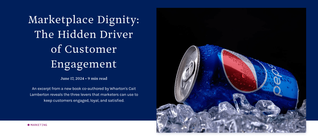 “Everywhere we turn, brands and organizations are under fire for failing to treat their customers with respect and dignity. In Marketplace Dignity, Wharton professor Cait Lamberton, Neela A. Saldanha, and Tom Wein introduce a tangible, practical way to take a stand on the fundamental value of humans, and in so doing, be a force for good in a society that increasingly demands that they do so. Marketplace dignity is the idea that customers seek respect and recognition from the firms they interact with, not just rational or emotional benefits. Marketplace dignity appeals to humans’ sense of justice and goes to the essence of what makes customers human. It is also a powerful driver of their engagement, loyalty, and satisfaction.